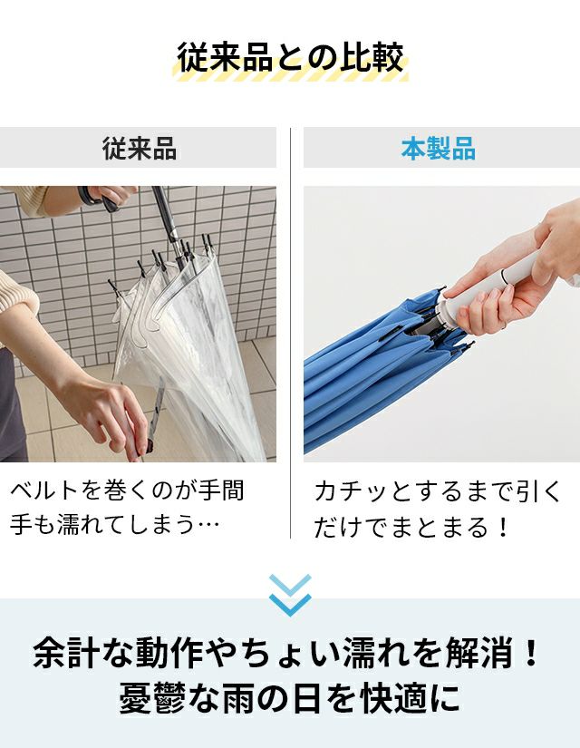 他の画像を見る ベルトのない、閉じるだけでスリムにまとまる傘です。最後に手で生地をまとめたり、ベルトで留める必要がなく、手を濡らさず、もたつく煩わしさもありません。 マーナ 【選べる2大特典】 傘 シュパット アンブレラ 62cm 雨傘 長傘 晴雨兼用 手が濡れない 畳める ベルトなし レディース メンズ 男女兼用 無地 おしゃれ かわいい シンプル 車 大人 スライド 16本骨 母の日 撥水 UVカット marna Shupatto 当店特別価格 ¥ 6,930 税込 詳細を見る お気に入りに登録する