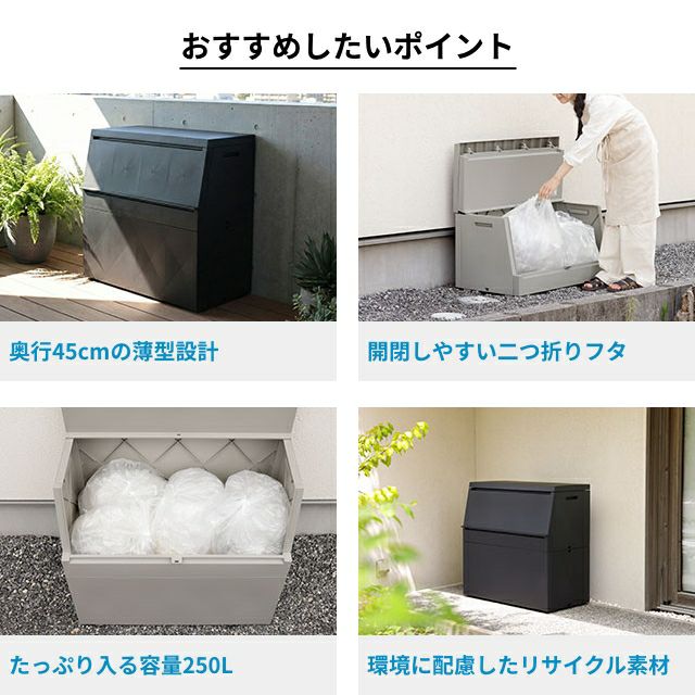 他の画像を見る 奥行45cmの薄型設計で狭いベランダにも置ける大容量屋外ストッカー。二つ折り蓋で壁際でも開閉スムーズ。環境に優しいリサイクル素材を使用した日本製収納庫です。 ソロウ 【選べる豪華特典】 出し入れがスムーズな屋外ストッカー 250L 屋外ゴミ箱 ベランダ収納 物置 収納ボックス マルチストレージボックス 屋外収納 屋外ボックス ダストボックス ごみ箱 おしゃれ スリム 奥行45 フタ付き 蓋つき 大容量 SOLOW 当店特別価格 ¥ 16,500 税込 詳細を見る お気に入りに登録する