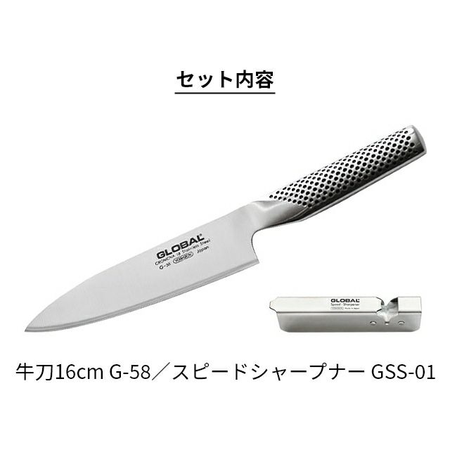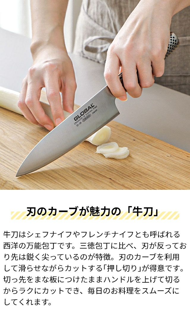他の画像を見る 「GLOBAL 牛刀16cm」は小ぶりな牛刀。刃のカーブを利用して滑らせながらカットする「押し切り」が得意です。切っ先をまな板につけたまま切るからラクにカットできます。 グローバル 【豪華特典付き】 包丁 牛刀16cm 2点セット GST-A58 シェフナイフ 万能包丁 オールステンレス 日本製 燕三条 小さめ 家庭用 両刃 右利き 左利き プロ 切れ味 おしゃれ 一人暮らし よく切れる ブランド おすすめ 一体型 GLOBAL 当店特別価格 ¥ 12,100 税込 詳細を見る お気に入りに登録する