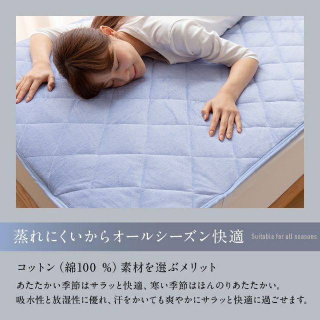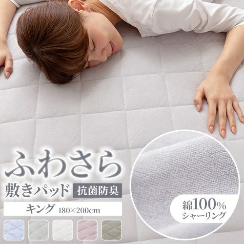 他の画像を見る 天然素材の綿で汗をかいてもムレずに爽やか。シャーリング加工を施したパイル生地が、さらさらとした優しい肌ざわり。オールシーズン快適に使える敷きパッドです。 敷きパッド キング ベッドパッド 敷きマット ベッドシーツ 夏用敷きパッド タオル地敷きパッド 敷パッド ベッドパット パイル 綿100% オールシーズン ふわさら ふわふわ さらさら 汗取り 抗菌防臭 シャーリング 洗える かわいい おしゃれ 当店特別価格 ¥ 3,990 税込 詳細を見る お気に入りに登録する