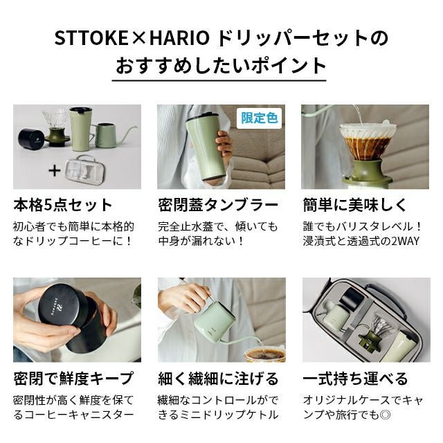 他の画像を見る STTOKE×HARIOが夢のコラボ!ハンドドリップ初心者でも、簡単に本格ドリップコーヒーが楽しめる5点セット。まとめて持ち運べる専用ケース付きで、どこでも至高の一杯に。 ストーク ハリオ STTOKE×HARIO ドリッパーセット タンブラー マグボトル コーヒーキャニスター ドリップケトル ドリップボット マイボトル セラミック 浸漬式 蓋付き 持ち運び こぼれない かわいい 保温 保冷 おしゃれ 二重 真空断熱 Dripper Set 当店特別価格 ¥ 14,850 税込 詳細を見る お気に入りに登録する