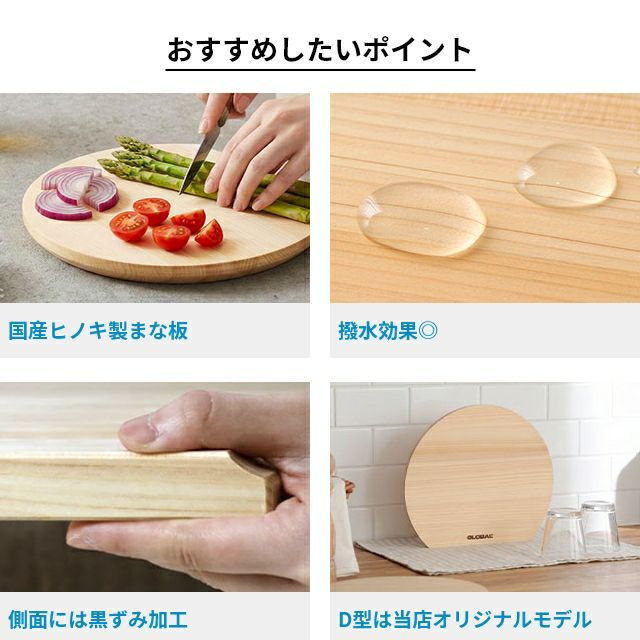 他の画像を見る GLOBAL包丁に最適なヒノキまな板。撥水加工で黒ずみを防止。当店限定の半月の形をした「D型」モデルは、限られたスペースを有効活用できるアイデア形状。 【豪華特典付き】 グローバル GLOBAL カッティングボードD型 28cm まな板 日本製 おしゃれ ひのき チーズ 小さい 大きい 厚い 厚め コンパクト 軽量 魚 収納しやすい 木目 やわらかい 両面 d型 かまぼこ型 半月型 当店特別価格 ¥ 6,050 税込 詳細を見る お気に入りに登録する