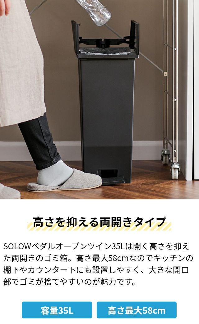 他の画像を見る 高さを抑えた両開きペダル式ゴミ箱35L ソロウ 【選べる豪華特典】 ゴミ箱 ペダル式 ペダルオープンツイン 35L GSLW0 ペダル式ゴミ箱 ゴミ箱 ダストボックス 35l 足踏み スリム 蓋付き 両開き 横開き 分別 棚下 キャスター フタ付き 日本製 バタフライ ペダル 袋止め SOLOW 当店特別価格 ¥ 4,070 税込 詳細を見る お気に入りに登録する