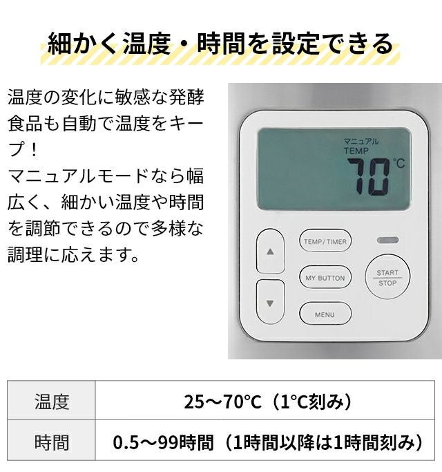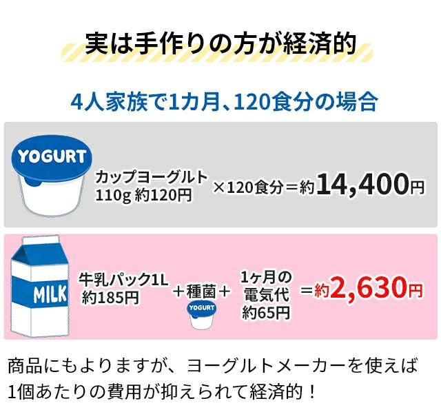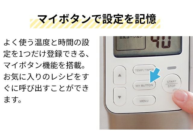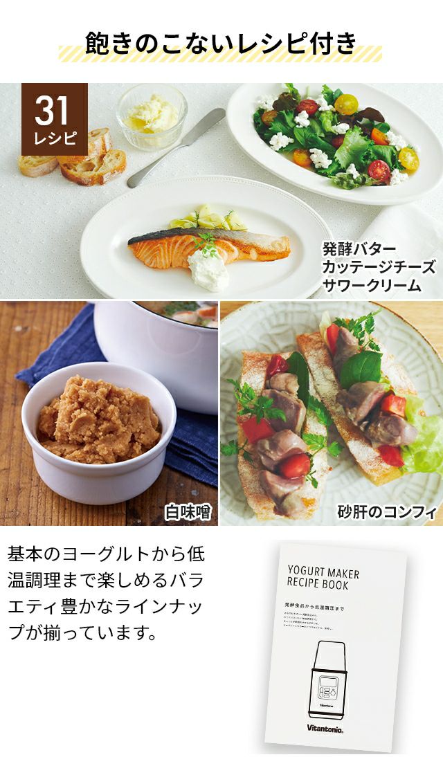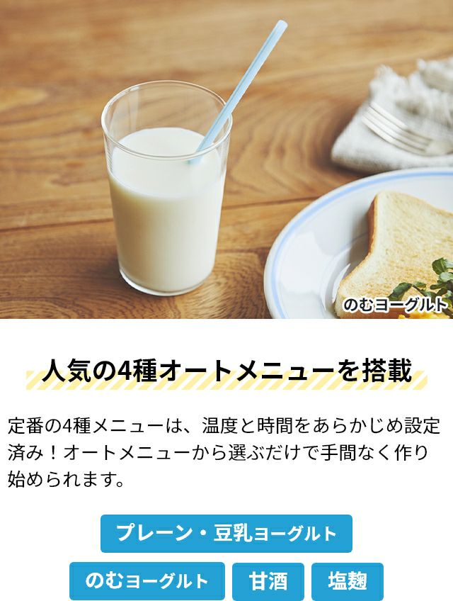 他の画像を見る 牛乳パックや豆乳パックを使って、手軽に自家製ヨーグルトが作れるヨーグルトメーカー。飲むヨーグルトを含む4つのオートメニューを搭載。豪華な31種レシピブック付き! ビタントニオ 【選べる豪華特典】 ヨーグルトメーカー VYG-30 発酵器 甘酒 塩麹 豆乳パック対応 1000ml 500ml カスピ海ヨーグルト タイマー機能 牛乳パック 低温調理 ローストビーフ 鶏ハム カッテージチーズ 飲むヨーグルト 味噌 Vitantonio 当店特別価格 ¥ 7,920 税込 詳細を見る お気に入りに登録する