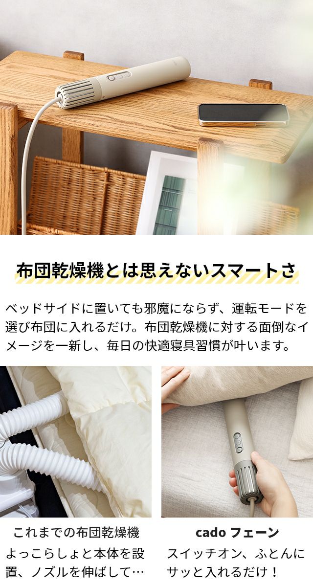 他の画像を見る 小型軽量、出しっぱなしにできる美しいデザインの布団乾燥機。面倒な準備・片付け不要、挿し込むだけで幸せ心地のふとんが完成。ダニ退治も可能です。 カドー 【選べる豪華特典】 布団乾燥機 FOEHN LITE(フェーン ライト) FEN-L01 ふとん乾燥機 スティック型 布団 乾燥 布団ドライヤー ふとん ふとん乾燥 布団乾燥 コンパクト 小型 軽量 スリム 静音 梅雨対策 除湿 おしゃれ ダニ退治 トコジラミ 靴 シングル cado 当店特別価格 ¥ 16,500 税込 詳細を見る お気に入りに登録する