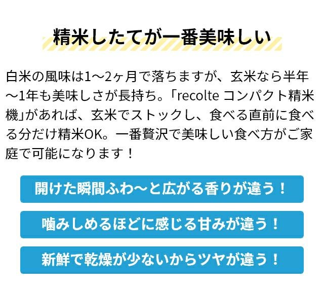 他の画像を見る 白米の風味は1~2ヶ月で落ちますが、玄米なら半年~1年も美味しさが長持ち。玄米でストックし、食べる直前に食べる分だけ精米すれば、一番贅沢で美味しい食べ方に! 【選べる豪華特典】 精米機 家庭用 レコルト recolte コンパクト精米機 RRP-1 小型 精米器 2合 玄米 胚芽米 分づき米 対応 おしゃれ お手入れ簡単 ギフト プレゼント 結婚祝い 新築祝い ライスクリーナー 当店特別価格 ¥ 13,200 税込 詳細を見る お気に入りに登録する