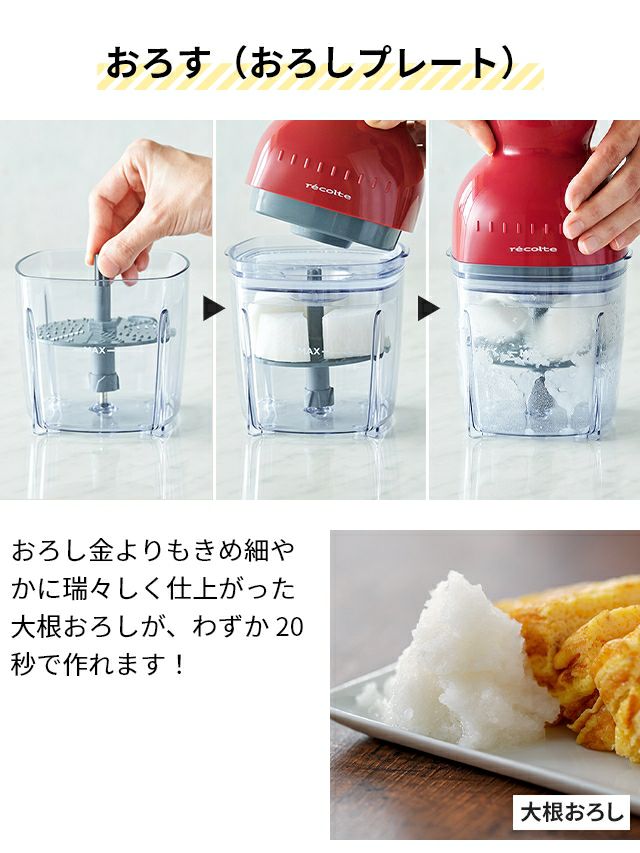 他の画像を見る シリーズ累計販売台数約80万台!コードレスタイプが新登場!におい移りしにくいガラスカップで使いやすさアップ!従来の機能プラス「鬼おろし」も簡単にできます。 レコルト【限定4大特典・レシピ付き】 フードプロセッサー レコルト カプセルカッターボンヌ コードレス RCP-7 ブレンダー ミキサー 氷も砕ける 電動 小型 ガラス製 大根おろし 氷対応 氷も砕ける 離乳食 泡立て recolte 当店特別価格 ¥ 9,900 税込 詳細を見る お気に入りに登録する