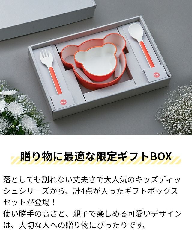 他の画像を見る 子ども食器2点とカトラリーが入った4点セット。プラスチック素材の割れにくさと、漆器のような美しさ・肌触りを両立。ギフトボックス入りで出産祝いに最適です。 タック 子ども食器セット キッズディッシュ ギフトボックス ベア マイン キッズ食器 キッズカトラリー 子ども用食器セット プレート 皿 マグカップ コップ スプーン フォーク ボウル 日本製 おしゃれ 食洗機対応 tak. KIDS DISH gift box bear mine 当店特別価格 ¥ 3,520 税込 詳細を見る お気に入りに登録する