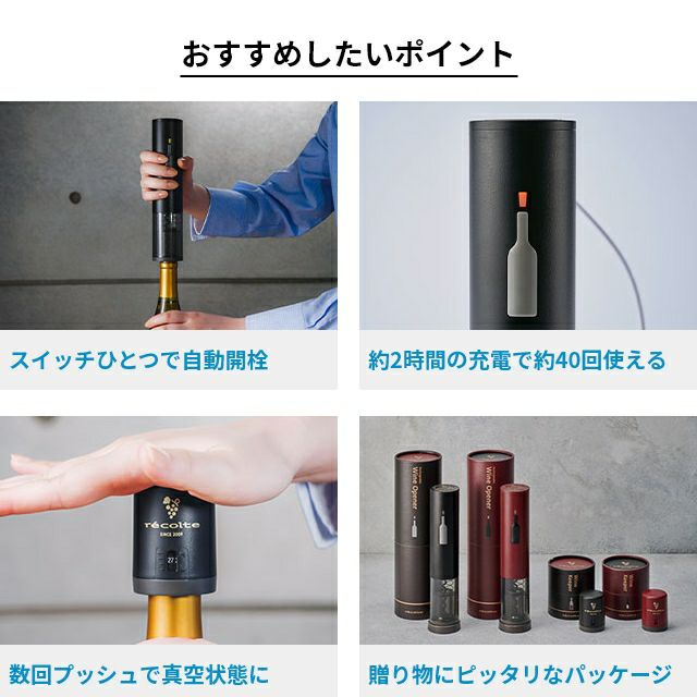 他の画像を見る 力もコツもいらないレコルト充電式ワインオープナーと、飲みかけのワインの酸化を遅らせることができるレコルトのワインキーパーをセットでお届けします。 【選べる豪華特典】 レコルト ワインオープナー 電動 自動 ワインキーパー セット おしゃれ 簡単 USB充電 RWO-1 RWK-1 女性 プレゼント ギフト 結婚祝い ボトルオープナー 栓抜き コルク抜き recolte キッチン家電 便利グッズ 当店特別価格 ¥ 5,170 税込 詳細を見る お気に入りに登録する