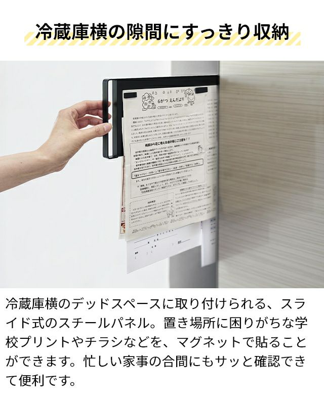 他の画像を見る 冷蔵庫横の隙間に取り付けできる、スライド式のスチールパネル。生活感が出がちな学校プリントやチラシを隠して収納できます。マグネットで貼り付けるだけの簡単設置! 山崎実業 マグネットボード マグネット冷蔵庫横隠せるスライドスチールパネルタワー 1859 1860 掲示板 おしゃれ 子供 a4 a3 tower 隙間収納 壁面収納 マグネット収納 プリント収納 キッチン収納 yamazaki タワーシリーズ 当店特別価格 ¥ 5,830 税込 詳細を見る お気に入りに登録する