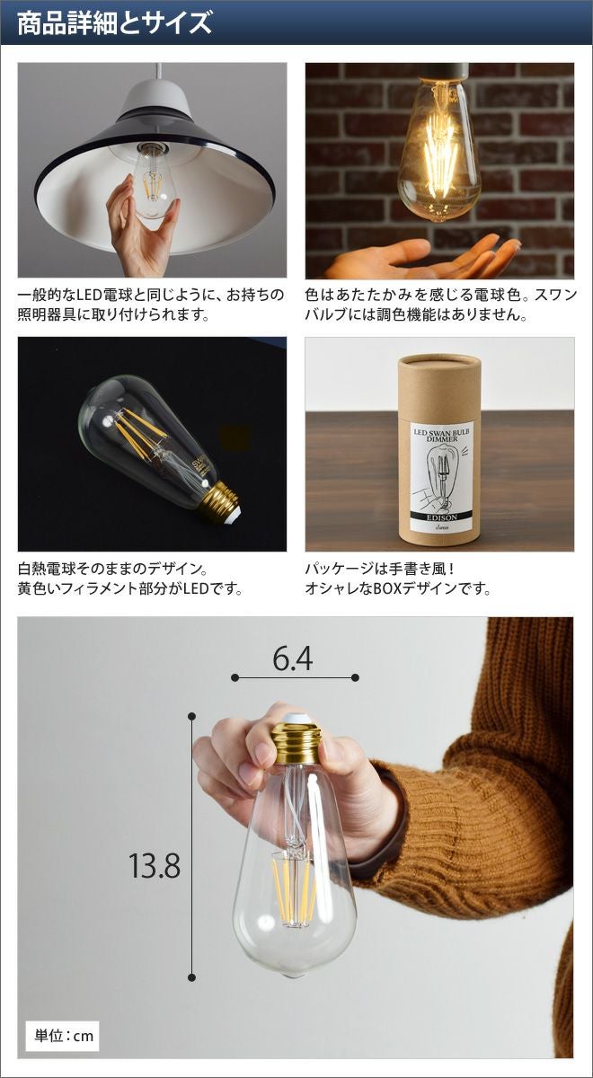 他の画像を見る フィラメントを再現した灯りがなんともノスタルジックなLED電球SWAN BULB。調光機能の備わった照明器具に対応しています! スワンバルブディマー エジソン LED電球 当店特別価格 ¥ 4,290 税込 詳細を見る お気に入りに登録する