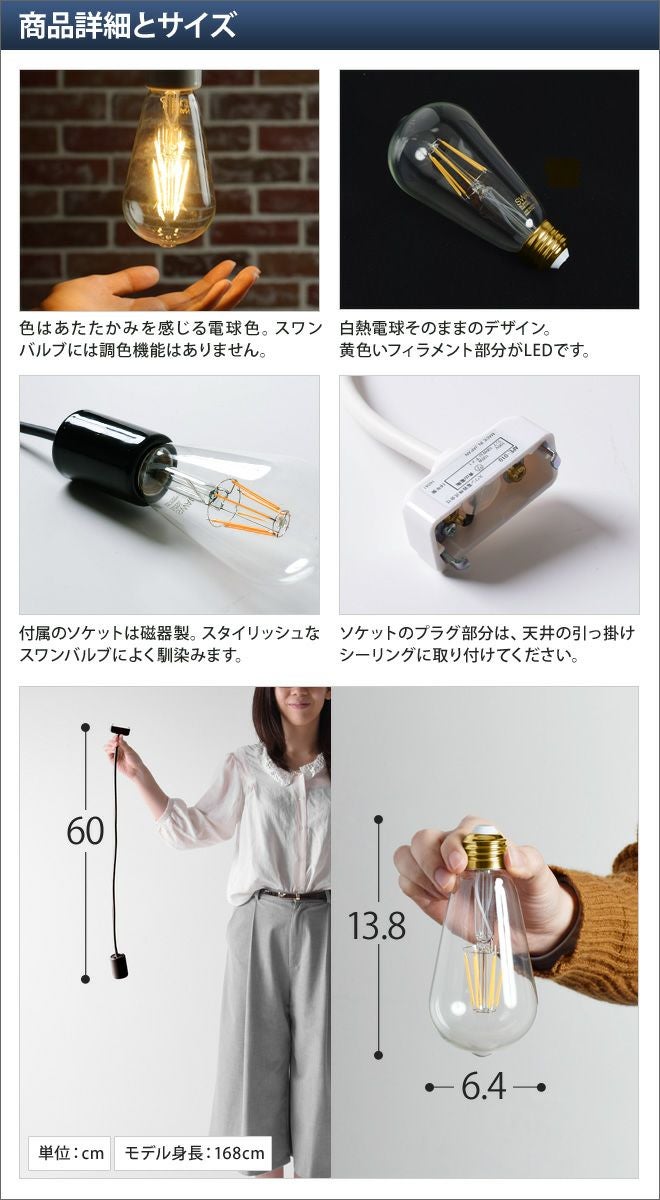 他の画像を見る フィラメントを再現した灯りがなんともノスタルジックなLED電球SWAN BULB。調光機能の備わった照明器具に対応しています! LEDスワンバルブディマーエジソン 電気ソケット60cmセット 当店特別価格 ¥ 7,480 税込 詳細を見る お気に入りに登録する