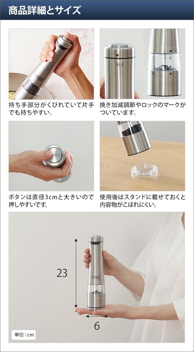 他の画像を見る 電動ミル//電動ミルソルト&ペッパー/ラッセルホブス/単品/1本/Russell/Hobbs/スパイスミル/マルチミル/ペッパーミル/ソルトミル/LEDライト/コショウ/胡椒/香辛料/岩塩/北欧/乾電池タイプ 電動ミル 【選べる豪華特典】 電動ミルソルト&ペッパー ラッセルホブス 単品 1本 スパイスミル マルチミル ペッパーミル ソルトミル LEDライト コショウ 胡椒 7921JP 当店特別価格 ¥ 4,400 税込 詳細を見る お気に入りに登録する