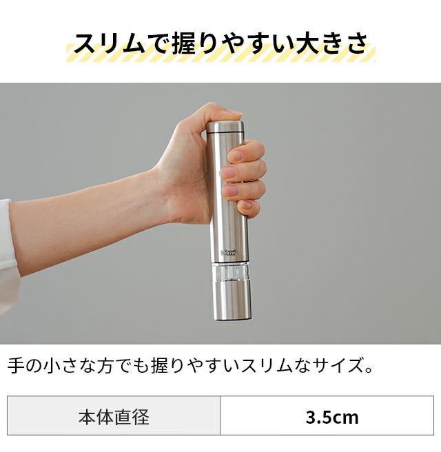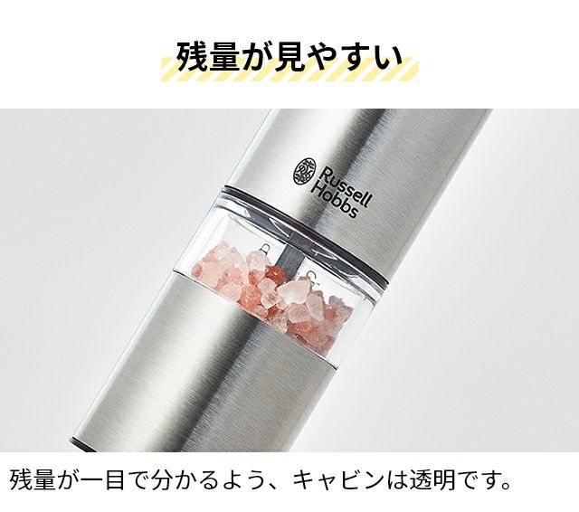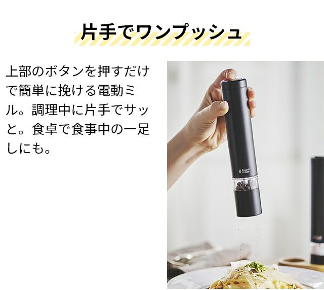 他の画像を見る 電動ミル/ミル/ペッパーミル/スパイスミル/おしゃれ/こしょう/塩/アウトドア/粉砕/インテリア/岩塩/強力/胡椒/キッチン用品/塩コショウ/コンパクト/ブラックペッパー/小型/Russell/Hobbs/ラッセルホブス/電動ミル ラッセルホブス【選べる豪華特典】 電動ミル ソルト&ペッパー ミニ 2本セット 7933JP 電動ミル スパイスミル ペッパーミル コンパクト コードレス グラインダー 胡椒 岩塩 ブラックペッパー 調味料 調整 粗挽き 中挽き 細挽き ソルト スリム ハンディ Russell Hobbs 当店特別価格 ¥ 5,500 税込 詳細を見る お気に入りに登録する